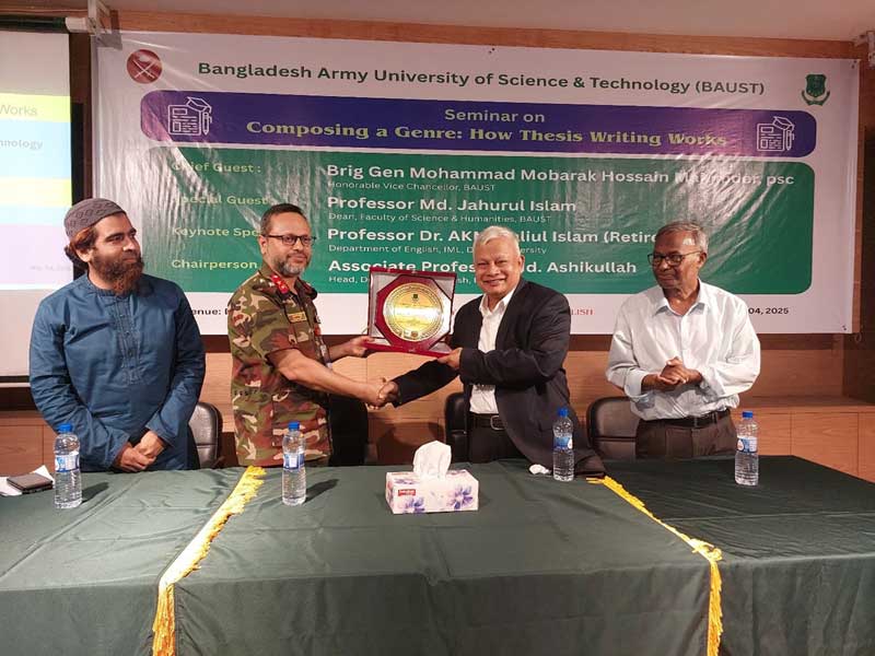 শেষে বাংলাদেশ আর্মি বিজ্ঞান ও প্রযুক্তি বিশ্ববিদ্যালয়ের পক্ষ থেকে সেমিনারের কি- নোট উপস্থাপক ঢাকা বিশ্ব বিদ্যালয়ের আধুনিক ভাষা ইন্সটিটিউট ও ইংরেজি বিভাগের অবসরপ্রাপ্ত শিক্ষক প্রফেসর ড. এ কে এম ওয়ালিউল ইসলামকে একটি ক্রেস্ট প্রদান করা হয়। বিশ্ব বিদ্যালয়ের উপাচার্য (ভিসি) ব্রিগেডিয়ার জেনারেল মোহাম্মদ মোবারক হোসেন মজুমদার, পিএসসি ওই ক্রেস্টটি তাঁর হাতে তুলে দেন।