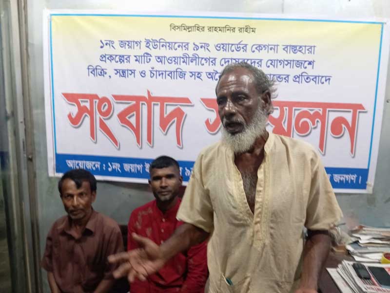 সংবাদ সম্মেলনে তিনি অভিযোগ করে বলেন, স্থানীয় মাটি মতিন ও হাসেম আমাকে ভয়ভীতি দেখিয়ে আমার বসতঘরসহ আশেপাশের জায়গার মাটি জোর করে কেটে নিয়ে যায়। এতে আমার ঘর যে কোন সময় ধসে পড়তে পারে। তিনি প্রশাসনের কাছে মাটি খেকোদের বিরুদ্ধে আইনানুগ ব্যবস্থা গ্রহণের দাবী জানান। এসময় আরো বক্তব্য রাখেন, প্রতিবেশী আবু তালেব, মো.স্বপন, আব্দর রহিম।
