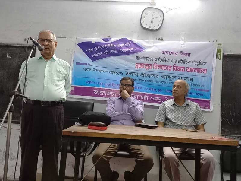 এতে প্রবন্ধ উপস্থাপন করেন এবং প্রধান অতিথি ছিলেন রাজশাহী বিশ^বিদ্যালয়ের সাবেক রেজিষ্ট্রার ও সৈয়দপুর সরকারি বিজ্ঞান কলেজের সাবেক অধ্যক্ষ প্রফেসর মো. আব্দুস সালাম।