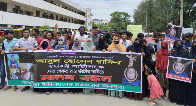 নোয়াখালীর সদর উপজেলার অশ্বদিয়া ইউনিয়নে ছাত্রদলকর্মি আবুল হোসেন রাফির (১৯) হত্যাকারীকে দ্রুত গ্রেপ্তার ও বিচারের দাবিতে জেলা প্রশাসকের কার্যালয়ের সামনে মানববন্ধন ও বিক্ষোভ সমাবেশ করা হয়েছে।