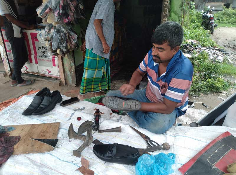 দিনভর ‘হাতারপাঁতি’ বা লোহার নেহাইসহ বিভিন্ন যন্ত্রপাতি নিয়ে বসে থাকাই চলে। চলে না কর্মমুখর ব্যস্ত হাতের দ্রুত সঞ্চালন। অন্যের ছেঁড়া জুতা সেলাই ও পরিপাটি করে দিয়ে সংসারের চুলা জ্বালানো আর পেটের আগুন নেভানোর পথে বাধা হয়ে দাঁড়িয়েছে মানুষের অভ্যাস।