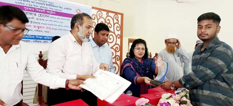 বগুড়ার নন্দীগ্রামে এসএসসি ও এইচএসসি পরীক্ষায় জিপিএ-৫ প্রাপ্ত শিক্ষার্থীদের মধ্য সর্বোচ্চ নম্বর প্রাপ্তদের সম্মাননা প্রদান করা হয়েছে। ( ২৪ জুলাই) বৃহস্পতিবার সকালে উপজেলা পরিষদ মিলনায়তনে জেলা শিক্ষা অফিস ও উপজেলা মাধ্যমিক শিক্ষা অফিসের আয়োজন এ সম্মাননা প্রদান অনুষ্ঠান অনুষ্ঠিত হয়। উপজেলা নির্বাহী অফিসার মোসা.লায়লা আঞ্জুমান বানুর সভাপতিত্বে অনুষ্ঠিত উক্ত সম্মাননা প্রদান অনুষ্ঠানে প্রধান অতিথির বক্তব্য রাখেন, অতিরিক্ত জেলা প্রশাসক (শিক্ষা ও আইসিটি) আরাফাত হোসেন। এতে বিশেষ অতিথির বক্তব্য রাখেন, সহকারী কমিশনার (ভুমি) রোহান সরকার, জেলা শিক্ষা অফিসার রমজান আলী আকন্দ ও উপজেলা মাধ্যমিক শিক্ষা অফিসার শফিকুল ইসলাম। এসময় বিভিন্ন শিক্ষা প্রতিষ্ঠানের প্রধান গণ ও অভিভাবৃন্দ উপস্থিত ছিলেন। এই সম্মাননা অনুষ্ঠানটি পারফরমেন্স বেজড গ্রান্টস ফর সেকেন্ডারি ইন্সিটিটিউশনস স্কিম, এসইডিপি উদ্যোগে বাস্তবায়িত হয়। শেষে নির্বাচিত ৪০জন কৃতী শিক্ষার্থীদের হাতে ক্রেস্ট ও সনদপত্র তুলে দেওয়া হয়।