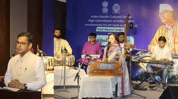 কাজী নজরুল ইসলামের ৪৯তম মৃত্যুবার্ষিকী উপলক্ষে ঢাকায় ভারতীয় হাইকমিশনের ইন্দিরা গান্ধী কালচারাল সেন্টারের (আইজিসিসি) আয়োজনে এক মনোমুগ্ধকর নজরুল সন্ধ্যা অনুষ্ঠিত হয়েছে। বৃহস্পতিবার গুলশানের আইজিসিসিতে অনুষ্ঠিত এই আয়োজনে বিশিষ্ট শিল্পী, সাংস্কৃতিক ব্যক্তিত্ব, নজরুল গবেষক, তরুণ প্রতিনিধিসহ বিপুল সংখ্যক শিল্পপ্রেমী উপস্থিত থেকে বিদ্রোহী কবিকে শ্রদ্ধার সঙ্গে স্মরণ করেন।