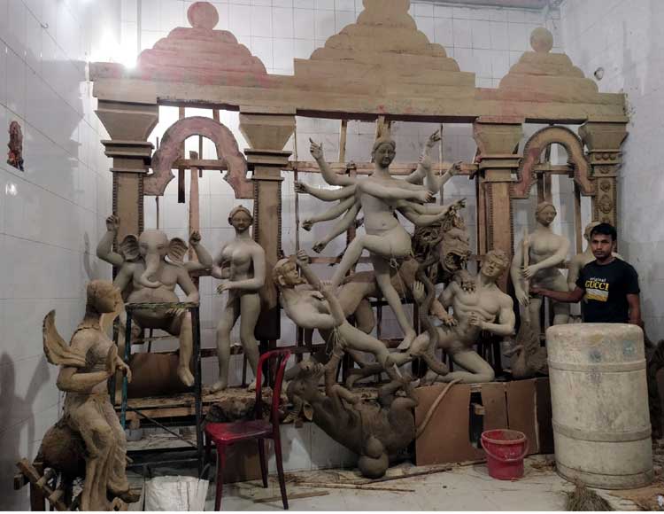 আকাশে বাতাশে চারিদিকে বইছে শরৎ এর আগমনী বার্তা। হিন্দু ধর্মালম্বীদের সর্ববৃহৎ শারদীয় দূর্গা উৎসবের আগমনে বাঙ্গালী'র ঘরে ঘরে বইছে আগাম আনন্দের বন্যা। সারা দেশের ন্যায় বগুড়ার আদমদীঘিতে শারদীয় দূর্গা উৎসবকে সামনে রেখে মন্ডবে মন্ডবে ইতিমধ্যে দেবী দূর্গা'র প্রতিমা তৈরীতে মহা ব্যস্ত সময় কাটাচ্ছে মৃৎশিল্পী কারীগর'রা। আগামী ২৮ সেপ্টেম্বর মহাষষ্টী'র মধ্য দিয়ে ৫ দিন ব্যাপী চলবে পুজোর উৎসব। ২ রা অক্টোবর বিজয়া দশমী'র মধ্য দিয়ে শেষ হবে দেবী দূর্গা'র পুজো। আদমদীঘি উপজেলার বিভিন্ন মন্ডব ঘুরে দেখা গেছে, মৃৎশিল্পী কারিগররা বাঁশ, খড়, মাটি, ধানের গুড়া সহ নানা রকম উপকরণ দিয়ে স্বর্গলোকের দেবী দূর্গার প্রতিমা সহ শিব, গনেশ, কার্তিক, লক্ষী, সরস্বতী, সিংহ, মহিষ, ময়ুর, ইদুঁর, পেঁচা তৈরীর কাজে মহা ব্যস্ত সময় কাটাচ্ছে মৃৎশিল্পী কারিগররা। প্রতিমা তৈরীর কারিগররা জানায়, পুজোর আর বেশী সময় নেই। তাই তারা কাঁদা মাটি যুক্ত মাটি দিয়ে নানা ধরনের কারুকার্যে স্বর্গলোকের দেবী দূর্গা সহ তার সঙ্গীদের প্রতিমা তৈরীর কাজ আগে ভাগেই শুরু করেছে। কেননা মাটির তৈরী প্রতিমা গুলো রৌদ্রে শুকিয়ে নিতে হয়। প্রায় মন্ডব গুলোতে ইতি মধ্যে মাটির কাজ শেষের দিকে। উপজেলার সান্তাহার পুরাতন বাজার সার্বজনীন দূর্গা মন্ডবে গিয়ে প্রতিমা তৈরীর কারিগর রনজিৎ সরকারের সাথে এ প্রতিনিধি'র কথা হলে মৃৎশিল্পী রনজিৎ বলেন, তার বাড়ী বগুড়া'র কাহালু উপজেলার দূর্গাপুর ভেকরা গ্রামে। ছোট বেলা থেকেই প্রতিমা তৈরীর প্রতি তার মনোযোগ হয়। শৈল্পীক কারুকার্য শেখার জন্য সে ভারতে নদীয়াতে এক মৃৎশিল্পীর কাছে কিছু দিন কাজ শিকে দেশে ফিরে প্রতিমা তৈরীর কাজে নেমে পড়ে। প্রতি বছর সে প্রতিমা তৈরী করে সংসারের স্বচ্ছলতা ফিরিয়ে আনার পাশাপাশি অনেক স্বাবলম্বী হয়েছে।আদমদীঘি উপজেলা পুজা উদযাপন পরিষদের সভাপতি অসিত দেবনাথ বাপ্পা সাধারন সম্পাদক মিহির কুমার সরকার জানান, এবার আদমদীঘি উপজেলার ৬টি ইউনিয়ন ও ১ টি পৌরসভায় মোট ৬৫ টি মন্ডবে দূর্গা পুজা অনুষ্ঠিত হবে। উপজেলার প্রতিটা মন্ডব কমিটির নের্তৃবৃন্দকে রাতের বেলা প্রতিমা গুলো দেখভালের জন্য পাহারার দেয়ার পাশাপাশি প্রশাসন, স্থানীয় জনপ্রতিনিধিদের সাথে সমন্বয় রাখতে নির্দ্দেশ দেয়া হয়েছে। আদমদীঘি থানার অফিসার ইনর্চাজ মোস্তাফিজুর রহমান বলেন, পুজা মন্ডব গুলোর সুরক্ষা দিতে ইউনিয়ন বিট পুলিশের দ্বায়িত্বে থাকা থানার পুলিশ অফিসারগন সার্বক্ষনিক প্রতিটি মন্ডব পরিদর্শনের পাশাপাশি পুজা মন্ডবের কমিটির নের্তৃবৃন্দের সাথে যোগাযোগ করে যাচ্ছে। সব মিলিয়ে নিরাপত্তার কোন ঘারতি নেই।