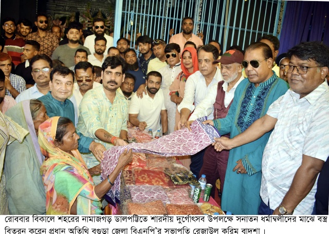 ডালপট্টি সর্বজনীন দূর্গাপূজা কমিটির সাধারণ সম্পাদক সমাজসেবক সুজিত প্রসাদ জয়সোয়ালের সার্বিক ব্যবস্থাপনায় প্রধান অতিথি হিসেবে তারেক রহমানের পক্ষে সকলের হাতে নতুন বস্ত্র তুলে দেন জেলা বিএনপির সভাপতি ও বগুড়া পৌরসভার সাবেক মেয়র রেজাউল করিম বাদশা। এসময় তিনি বলেন, বিএনপি সর্বদাই অসাম্প্রদায়িক চেতনার দল, যে দল কখনো মানুষে মানুষে ভেদাভেদ করে না। বিএনপির জন্মলগ্ন থেকেই সনাতন ধর্মাবলম্বী মানুষের পাশে ছিলো, আছে আর থাকবে। তিনি বলেন, বগুড়াসহ সারাদেশে শারদ উৎসব নির্বঘ্নে সম্পন্ন করতে তাদের অভিভাবক তারেক রহমানের নির্দেশনায় তৃণমূল থেকে শহর পর্যন্ত গঠন করা হয়েছে বিএনপির মনিটরিং সেল। তিনি সকলকে তারেক রহমানের পক্ষে শারদীয় শুভেচ্ছা জানিয়ে অসাম্প্রদায়িক এই বাংলাদেশে নির্বিঘ্নে শারদ উৎসব উদযাপনের আহ্বান জানান। তিনি আরো বলেন পূজার আগে তারেক রহমানের নির্দেশেই তারা উপহার নিয়ে সনাতন ধর্মাবলম্বী সকল মানুষের কাছে ছুটে যাচ্ছেন। বাদশা বলেন, হিন্দু মানেই আওয়ামী লীগ এই কথাটি সম্পূর্ণ ভুল ধারণা কারণ এই বাংলাদেশে সনাতন ধর্মাবলম্বীদের ৮০ ভাগ জায়গা আওয়ামীলীগই বিভিন্ন সময় দখল করেছে। যা আর কখনো এই সোনার বাংলাদেশ হবে না। অনুষ্ঠানে আমন্ত্রিত অতিথি হিসেবে সকলের সাথে শারদীয় শুভেচ্ছা বিনিময় করেন বিএনপি চেয়ারপার্সনের উপদেষ্টা ও কৃষকদল কেন্দ্রীয় কমিটির সিনিয়র সহ-সভাপতি সাবেক এমপি হেলালুজ্জামান তালুকদার লালু।