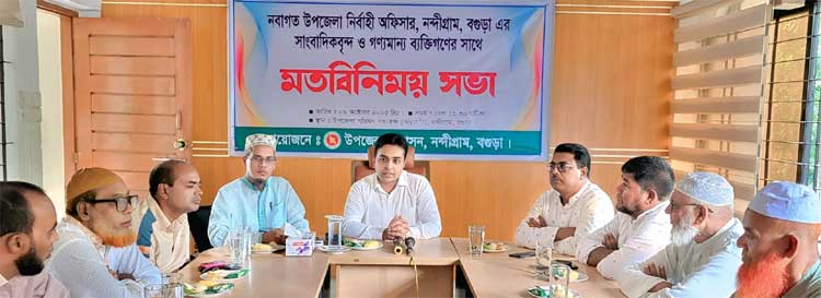 বগুড়ার নন্দীগ্রামে সাংবাদিকবৃন্দ ও গণ্যমান্য ব্যক্তিদের সঙ্গে নবাগত ইউএনও মোঃ আরিফুল ইসলামের মত বিনিময় সভা অনুষ্ঠিত হয়েছে। ৯অক্টোবর বৃহস্পতিবার বেলা ১১টায় উপজেলা পরিষদ সভাকক্ষ (ভদ্রাবতীতে) এ মত বিনিময় সভা অনুষ্ঠিত হয়। সভায় সভাপতিত্ব করেন, উপজেলা নির্বাহী অফিসার মোঃ আরিফুল ইসলাম। এসময় বক্তব্য রাখেন, উপজেলা প্রকল্প বাস্তবায়ন কর্মকর্তা সরদার ফজলুল করিম, উপজেলা বিএনপির সভাপতি মোঃ আলাউদ্দিন সরকার, উপজেলা জামায়াতের আমীর আব্দুর রহমান,উপজেলা বিএনপির সেক্রেটারী বেলায়েত হোসেন আদর, উপজেলার সাবেক চেয়ারম্যান ও জামায়াতের সাবেক আমীর নূরুল ইসলাম মন্ডল, সাবেক আমীর আনোয়ারুল হক, পৌর জামায়াতের অর্থ-সম্পাদক আব্দুস ছাত্তার, নন্দীগ্রাম বণিক সমিতির সভাপতি করিম সরদার । এসময় আরও বক্তব্য রাখেন, উপজেলা প্রেসক্লাবের সভাপতি মোঃ ফজলুর রহমান, সাধারণ সম্পাদক আক্তার হোসেন দুলাল, সহ-সভাপতি নূর মোহাম্মাদ বাদশাহ্, সিনিয়র সহ-সভাপতি জুলফিকার আলী ভুট্টো,দপ্তর সম্পাদক আব্দুল হাকিম, সদস্য মামুন আহমেদ, এনামুল হক আপেল, রুস্তম আলী রানা, নন্দীগ্রাম মডেল প্রেস ক্লাবের সাধারণ সম্পাদক জাকারিয়া লিটন, যুগ্ম-সাধারণ সম্পাদক আব্দুর রউফ উজ্জল, নন্দীগ্রাম প্রেস ক্লাবের সাধারণ সম্পাদক মনিরুজ্জামান, সহসভাপতি মিনহাজুর রহমান হাবিব, ও পাঠাগার সম্পাদক টিপু সুলতান, উপজেলা অনলাইন প্রেস ক্লাবের সেক্রেটারি মাসুদ রানা, সাংগঠনিক সম্পাদক রাকিব বাবু, প্রচার সম্পাদক নাজিম উদ্দিন, সদস্য আরাফাত হোসেন,