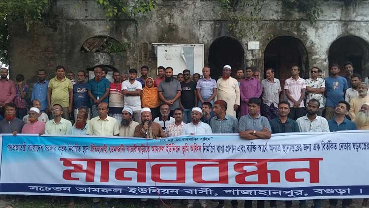 বগুড়ার শাজাহানপুর উপজেলার আমরুল ইউনিয়নের ডেমাজানী কাচারী বাড়িতে সরকারি নির্ধারিত স্থানে ভূমি অফিস নির্মাণে বাঁধা ও ষড়যন্ত্রের প্রতিবাদে এলাকাবাসী মানববন্ধন কর্মসূচি পালন করেছে।