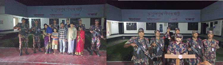 সীমান্ত রক্ষার পাশাপাশি মাদক ও মানব পাচার প্রতিরোধে বিজিবি সর্বদা সতর্কভাবে দায়িত্ব পালন করে আসছে। এরই ধারাবাহিকতায় গত ০৬ নভেম্বর রাত্রি ৮ ঘটিকায় অত্র ব্যাটালিয়নের অধীনস্থ রসুলপুর বিওপির একটি টহলদল গোপন সূত্রে খবর পেয়ে দ্রুত আন্তর্জাতিক শুন্য রেখা হতে আনুমানিক ১৪০ গজ বাংলাদেশের অভ্যন্তরে বাংলাদেশী নাগরিক মৃত জাহিরুল চৌধুরীর পুত্র মোঃ আফিত (১৪), গ্রাম- রসুলপুর (পলিপাড়া), ডাকঘর- মুরারীপুর, থানা- ফুলবাড়ী, জেলা- দিনাজপুর এর বসত বাড়ীতে কয়েকজন ভারতীয় নাগরিক বাংলাদেশ হতে ভারতে প্রবেশের জন্য একত্রিত হয়েছে। উক্ত সংবাদের প্রেক্ষিতে রসুলপুর বিওপির টহলদল কর্তৃক ঘটনাস্থলে উপস্থিত হয়ে বাড়িটি ঘেরাও করে রাখে। পরবর্তীতে এলাকার গণ্যমান্য ব্যক্তিদের মাধ্যমে মৃত জাহিরুল চৌধুরীর এর বাড়ী তল্লাশী করে ০৬ জন সন্দেহ জনক ব্যক্তিদেরকে আটক করে। আটককৃত ব্যক্তিরা হলেন