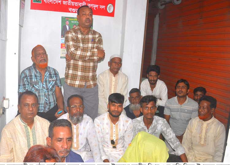 জাতীয়তাবাদী তৃনমূল দল কেন্দ্রীয় কমিটির সহ-সভাপতি ও বগুড়া জেলার সভাপতি মোঃ আব্দুল বারী এর সভাপতিত্বে এতে প্রধান আলোচকের বক্তব্য রাখেন সিনিয়র সাংবাদিক মহসিন আলী রাজু। দ্বিতীয় আলোচকের বক্তব্য রাখেন সংগঠনের জেলার উপদেষ্টা লাল মিয়া। এসময় আরো বক্তব্য রাখেন তৃণমূল দল জেলা শাখার সাধারণ সম্পাদক মাসুদুর রহমান মাসুদ, সিনিয়র সহ-সভাপতি মোঃ বাদশা প্রমানিক, সহ-সভাপতি জহির আহম্মেদ, যুগ্ম সাধারণ সম্পাদক মোঃ আজম, শহর কমিটির সভাপতি আব্দুস সোবহান শেখ, তৃণমূল দল নেতা রতন চৌধুরী, কামরুল ইসলাম, তারাজুল ইসলাম, মোঃ তাজ উদ্দিন, মুঞ্জু, দুলাল, আলামিন, আরিফ, নাদিম, মিলন, মামুন, বিজয়, গণি, জাহিদসহ প্রমুখ।