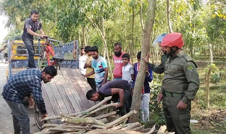 পাবর্তীপুরে বনবিভাগের গাছ কাটলেন আওয়ামী নেতা গাছ সহ ভ্যান আটক