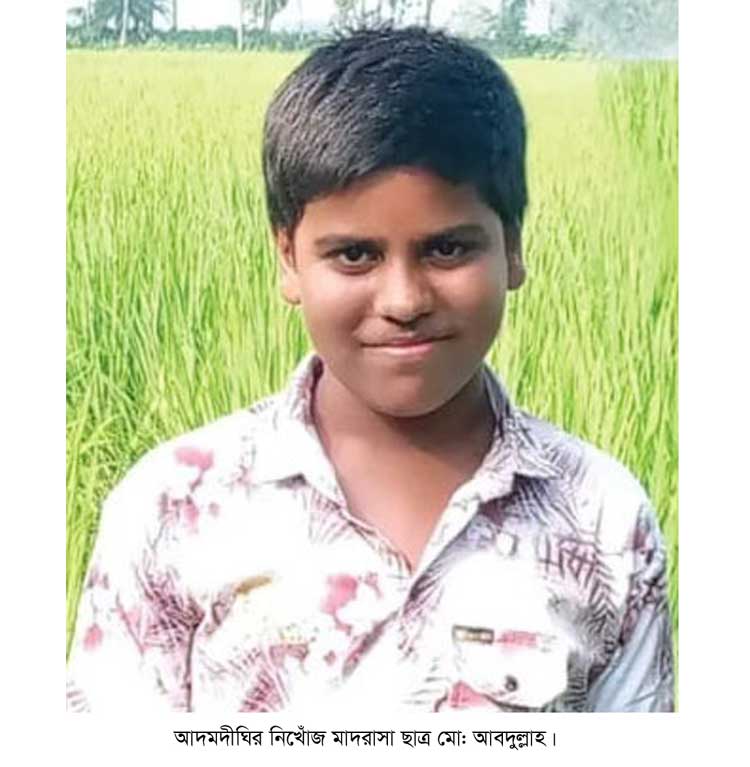 বগুড়ার আদমদীঘিতে মো: আবদুল্লাহ (১১) নামের ৫ম শ্রেনির এক মাদরাসা ছাত্র নিখেঁজের ১৭ দিন অতিবাহিত হলেও তার সন্ধান মিলেনি। ফলে সন্তান হারিয়ে তার পরিবারবর্গ হতাশায় পড়েছেন। মো: আবদুল্লাহ আদমদীঘি উপজেলার ছাতিয়ানগ্রাম ইউপির অন্তাহার গ্রামের সম্্রাট হোসেনের একমাত্র ছেলে। এ ঘটনায় গত ২৫ অক্টোবর নিখোঁজ ছাত্রের বাবা সম্্রাট হোসেন আদমদীঘি থানায় একটি নিখোঁজ বিষয়ক সাধারণ ডায়েরি করেন।