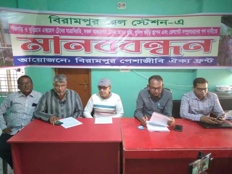 বিরামপুর রেল স্টেশনে পঞ্চগড় ও কুড়িগ্রাম আন্ত:নগর ট্রেনের যাত্রা বিরতির দাবিতে বুধবার মানববন্ধন ও সমাবেশ সফল করার লক্ষ্যে মঙ্গলবার (১৮ নভেম্বর) পেশাজীবি ঐক্য ফ্রন্ট সাংবাদিক সম্মেলন করেছে।
