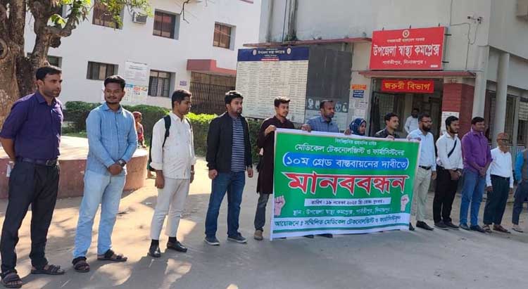 পার্বতীপুরে সম্মিলিত মেডিকেল টেকনোলজিস্ট ও ফার্মাসিস্টদের ১০ম গ্রেড বাস্তবায়নের দাবিতে মানববন্ধন