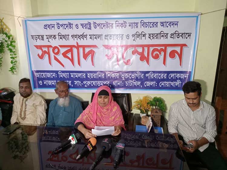নোয়াখালীর চাটখিলে ষড়যন্ত্রমূলক মিথ্যা গণধর্ষণ মামলায় ফাঁসানো ও পুলিশি হয়রানির প্রতিবাদে সংবাদ সম্মেলন করেছে ভুক্তভোগী পরিবার।