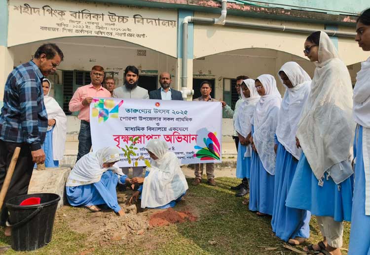 নওগাঁর পোরশায় তারুণ্যের উৎসব উদযাপন উপলক্ষ্যে উপজেলা প্রশাসনের আয়োজনে একযোগে উপজেলার সকল প্রাথমিক ও মাধ্যমিক শিক্ষা প্রতিষ্ঠানে বৃক্ষ রোপণ করা হয়েছে। গতকাল মঙ্গলবার সকাল ১০টায় উপজেলার শহীদ পিংকু বালিকা উচ্চ বিদ্যালয়ে বৃক্ষ রোপণের উদ্বোধন করেন উপজেলা নির্বাহী অফিসার রাকিবুল ইসলাম। এসময় প্রাথমিক শিক্ষা অফিসার সাজ্জাদ হোসেন, মাধ্যমিক শিক্ষা অফিসার শামসুল কবিরসহ শিক্ষা প্রতিষ্ঠানের শিক্ষক ও শিক্ষার্থী উপস্থিত ছিলেন। একই দিনে উপজেলার ৮৭টি প্রাথমিক বিদ্যালয় ও ২৭ টি মাধ্যমিক বিদ্যালয়ে একযোগে ফলজ ও বনজ বৃক্ষের পাশাপাশি স্কুল গেটের দু’পাশে একটি করে সোনালু ও জারুল গাছের চারা রোপণ করা হয়েছে।