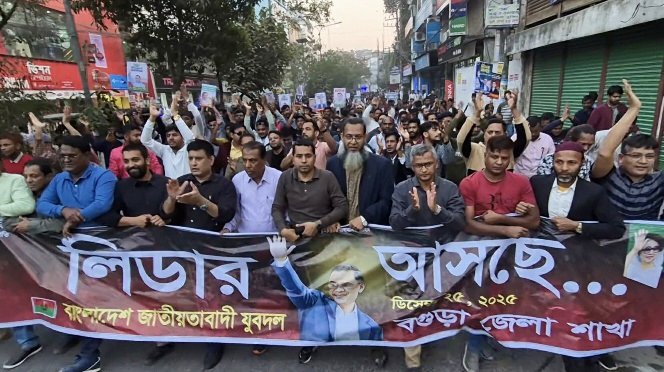 আগামী ২৫শে ডিসেম্বর বাংলাদেশে আসছেন বিএনপির ভারপ্রাপ্ত চেয়ারম্যান তারেক রহমান। দীর্ঘ প্রায় ১৮ বছর পর তার স্বদেশ প্রত্যাবর্তন উপলক্ষে বগুড়ায় স্বাগত মিছিল করেছে বাংলাদেশ জাতীয়তাবাদী যুবদল। বৃহস্পতিবার বিকেলে শহরের মোহাম্মদ আলী হাসপাতাল মাঠের সামনে থেকে শুরু হয়ে মিছিলটি সাতমাথা হয়ে জেলা বিএনপি কার্যালয়ে গিয়ে শেষ হয়।