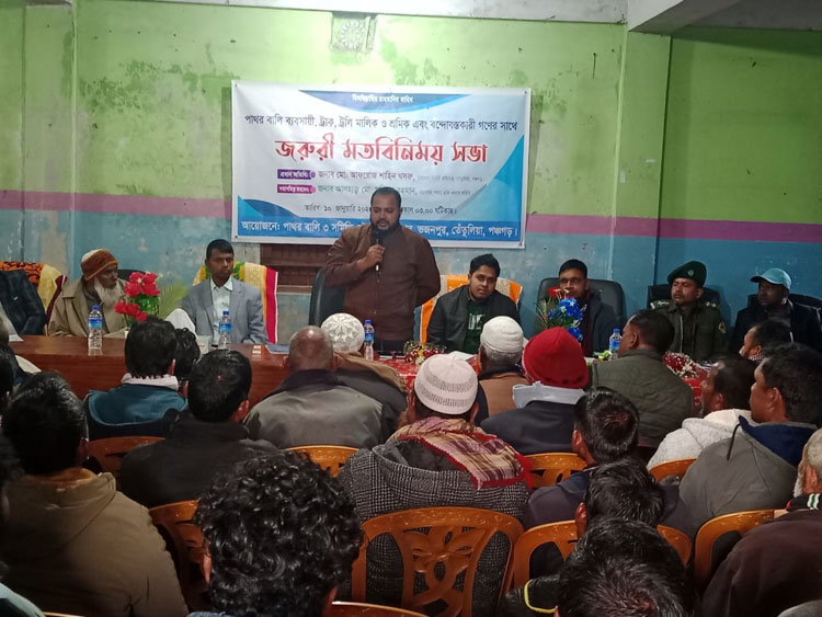 পঞ্চগড়ে পাথর বালি ব্যবসায়ী, ট্রাক, টলি মালিক ও শ্রমিক বন্দোবস্তকারীগণের সাথে এক জরুরী মতবিনিময় সভা অনুষ্ঠিত হয়েছে। শনিবার(১০ জানুয়ারি)বিকালে পঞ্চগড়ের তেঁতুলিয়া উপজলার ভজনপুর পাথর বালি যৌথ ফেডারেশন এর উদ্যোগে নির্মাণ সামগ্রী সৃষ্ট বায়ুদূষণ নিয়ন্ত্রণ ও সড়ক দুর্ঘটনা প্রতিরোধে পাথর বালি ব্যবসায়ী, ট্রাক, টলি মালিক ও শ্রমিক বন্দোবস্তকারীগণের সাথে মতবিনিময় সভা আয়োজন করা হয়। উক্ত সভায় প্রধান অতিথি হিসেবে উপস্থিত ছিলেন তেঁতুলিয়া
