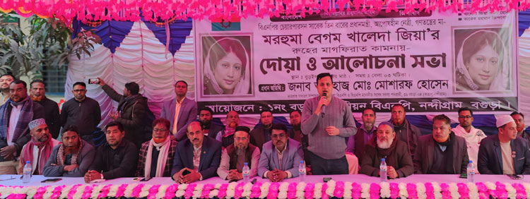 বগুড়ার নন্দীগ্রামে বাংলাদেশ জাতীয়তাবাদী দল (বিএনপি)-এর চেয়ারপারসন, সাবেক তিন বারের প্রধানমন্ত্রী মরহুমা বেগম খালেদা জিয়ার রুহের মাগফেরাত কামনায় দোয়া ও আলোচনা সভা অনুষ্ঠিত হয়েছে।