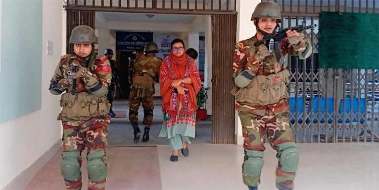 তবে কিছুক্ষণ পর জানা যায়, পুরো ঘটনাটি বাস্তব নয়। আগামী ১২ ফেব্রুয়ারি অনুষ্ঠিতব্য জাতীয় সংসদ নির্বাচন সামনে রেখে আইনশৃঙ্খলা পরিস্থিতি স্বাভাবিক রাখতে যৌথ বাহিনীর একটি পরিকল্পিত মহড়ার অংশ ছিল এই দৃশ্য।