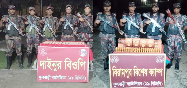 গত ৩০ মার্চ ২০২৬ তারিখ ফুলবাড়ী ব্যাটালিয়ন (২৯ বিজিবি) এর অধীনস্থ বিরামপুর বিশেষ ক্যাম্প (২০০০ ঘটিকা), রানীনগর বিওপি (২২০০ ঘটিকা) এবং দাইনুর বিওপি (২৩০০ ঘটিকা) কর্তৃক পৃথক পৃথক ০৩টি মাদক ও চোরাচালান প্রতিরোধ অভিযান পরিচালনা করে মালিকবিহীন ৩৩৬ বোতল বাংলাদেশী যৌন উত্তেজক সিরাপ, ১৯৪০ পিস ভারতীয় নেশাজাতীয় ট্যাবলেট, ২৩ বোতল বিদেশী মদ এবং ১৯ বোতল ভারতীয় ইস্কফ সিরাপ আটক করতে সক্ষম হয়। মালিকবিহীন আটককৃত মাদকদ্রব্য ও চোরাচালানী মালামালের সিজার মূল্য ২,৪৭,৭০০/- (দুই লক্ষ সাতচল্লিশ হাজার সাতশত) টাকা।