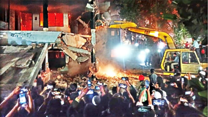 ধানমন্ডির ৩২ নম্বরে এক্সক্যাভেটর ও ক্রেন নিয়ে ভেঙে ফেলা হল বঙ্গবন্ধু শেখ মুজিবুর রহমানের বাড়ি। ধানমন্ডি ৫ নম্বরে শেখ হাসিনার বাসভবন সুধা সদন পুড়িয়ে দেওয়া হয়েছে।